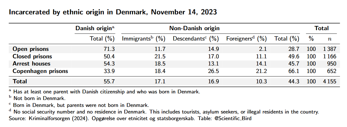 Unlike in Sweden, annual reports are issued by the Danish government and published by Statistics Denmark. They consistently find that people with foreign background are overrepresented in crime. Individuals with foreign background are also overrepresented in prisons (Kriminalforsorgen, 2024).