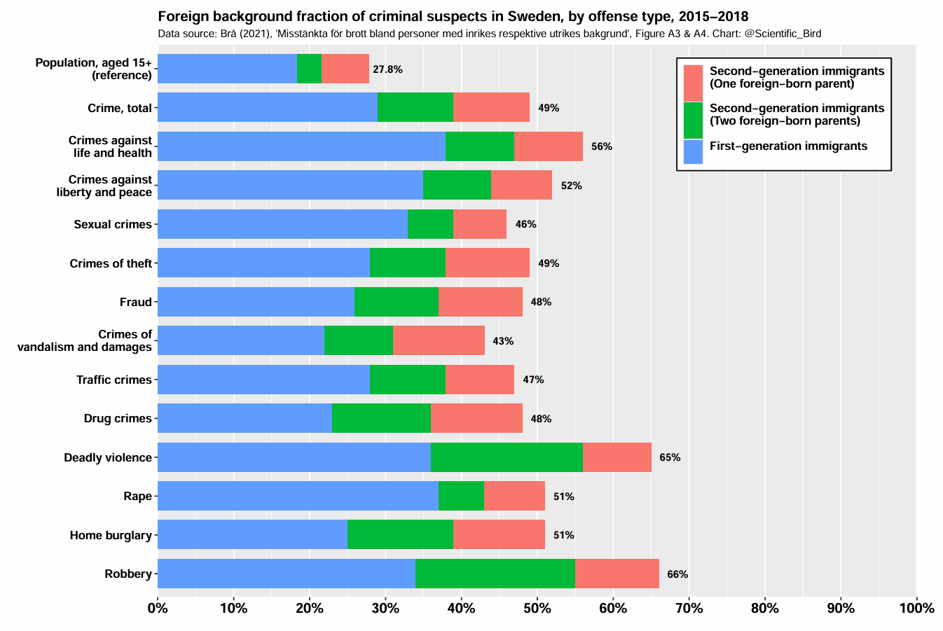 In a review of Swedish data, criminologist Amber Beckley (2015) writes: “Studies unequivocally show that people with a foreign background have about double the rate of crime compared to people with a Swedish background … The crime rate disparity persists after standardizing for socioeconomic factors.”